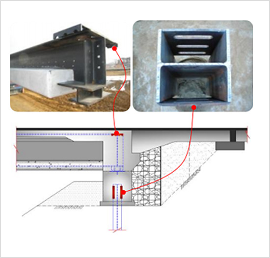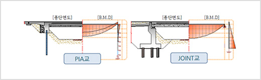 PIA교는 강합성거더를 적용하여 장경간 및 저형고가 가능하며 소교대 및 일렬배치 말뚝을 적용하여 토압과 하부구조의 크기를 최소화시킬 수 있고 무다짐 뒤채움재를 이용하여 수동토압 저갈 및 시공성을 향상시킨 일체식 교대 교량